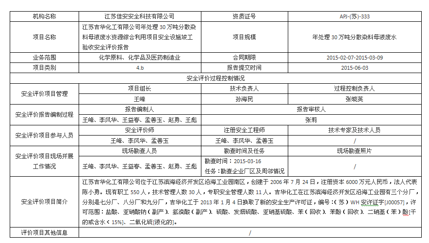 江蘇吉華化工有限公司 年處理30萬噸分散染料母液廢水資源綜合利用項(xiàng)目安全設(shè)施竣工驗(yàn)收安全評(píng)價(jià)報(bào)告